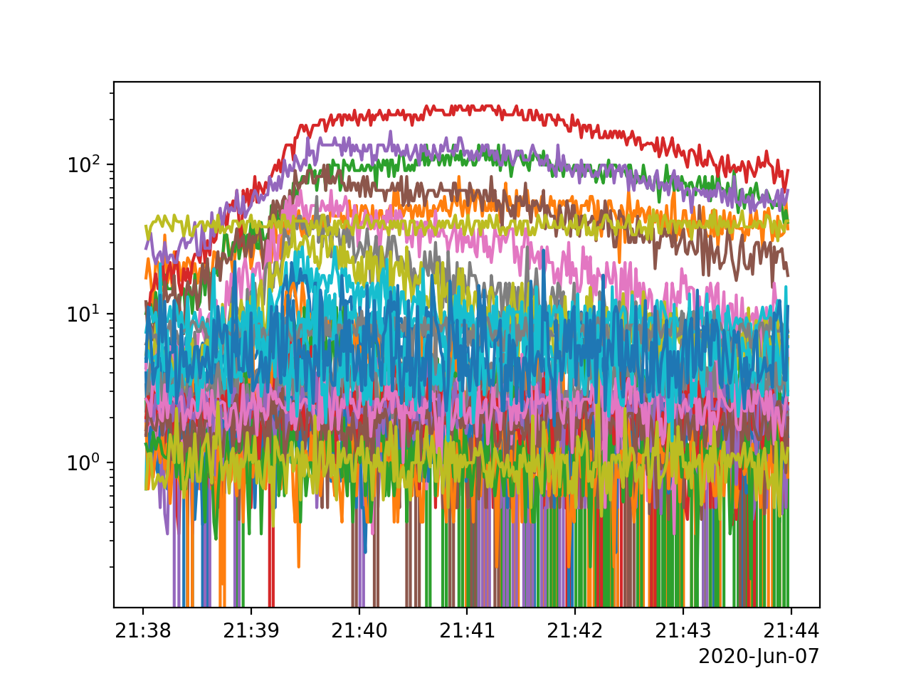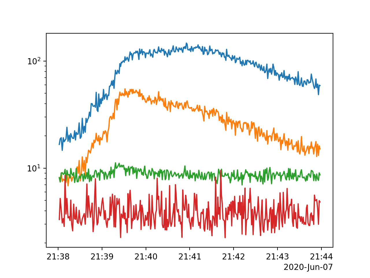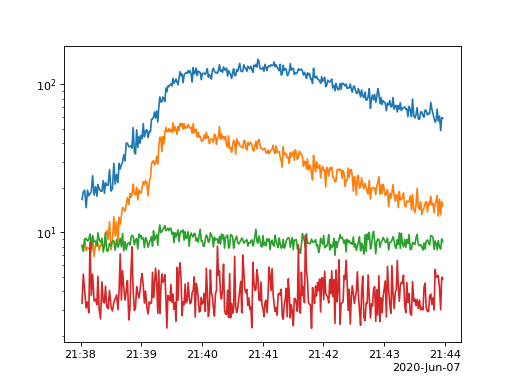 There is a larger flare toward the end of the time range lets zoom in on this region from 21:30 to 22:00 on 2020-06-07.